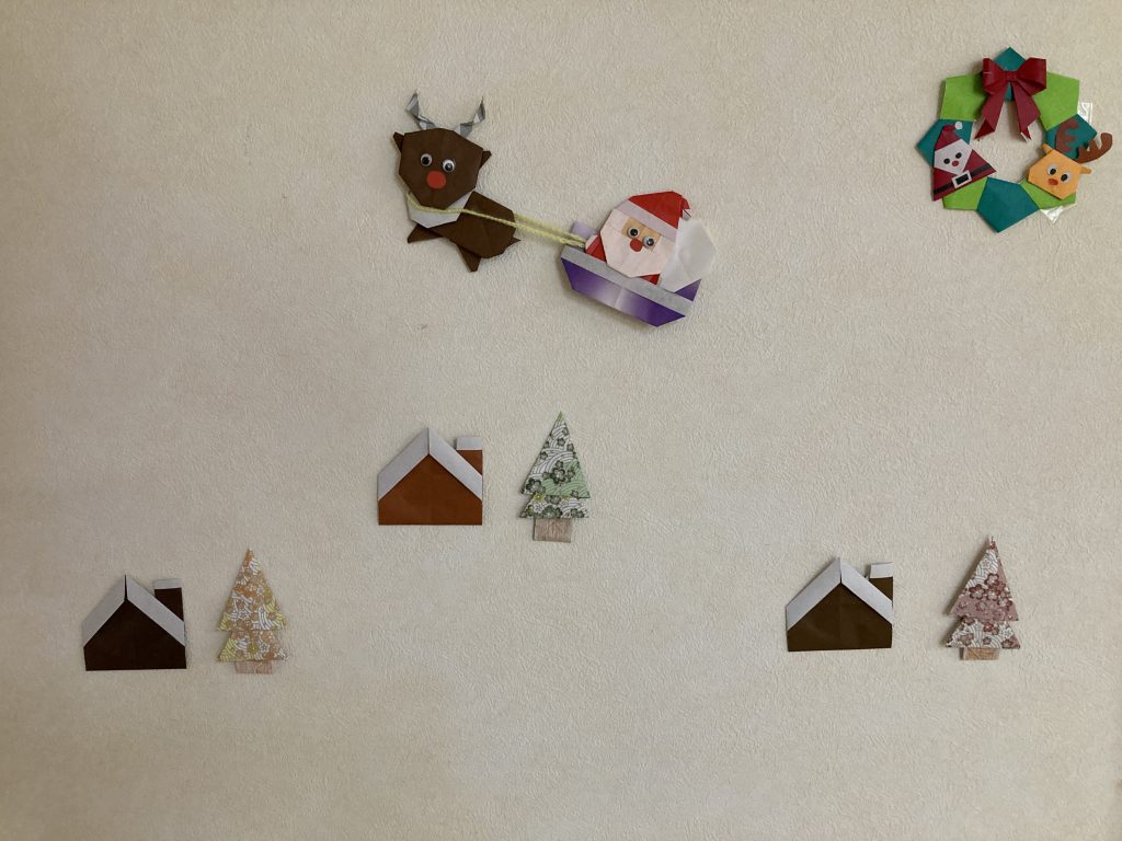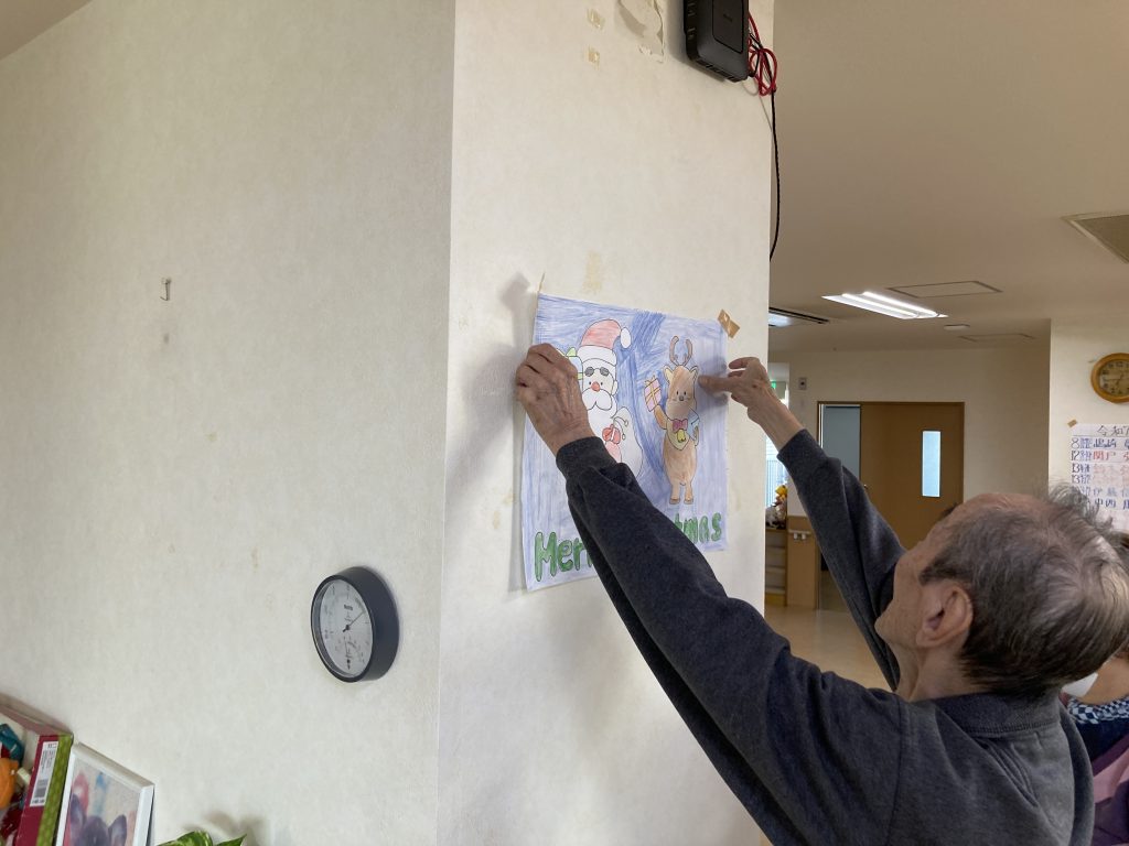 ソリ🛷に乗ったサンタ🎅やトナカイ等の飾りを、入居者さん同士で相談しながら取り付けていました‼