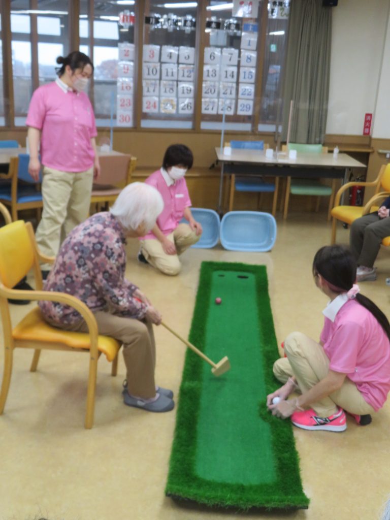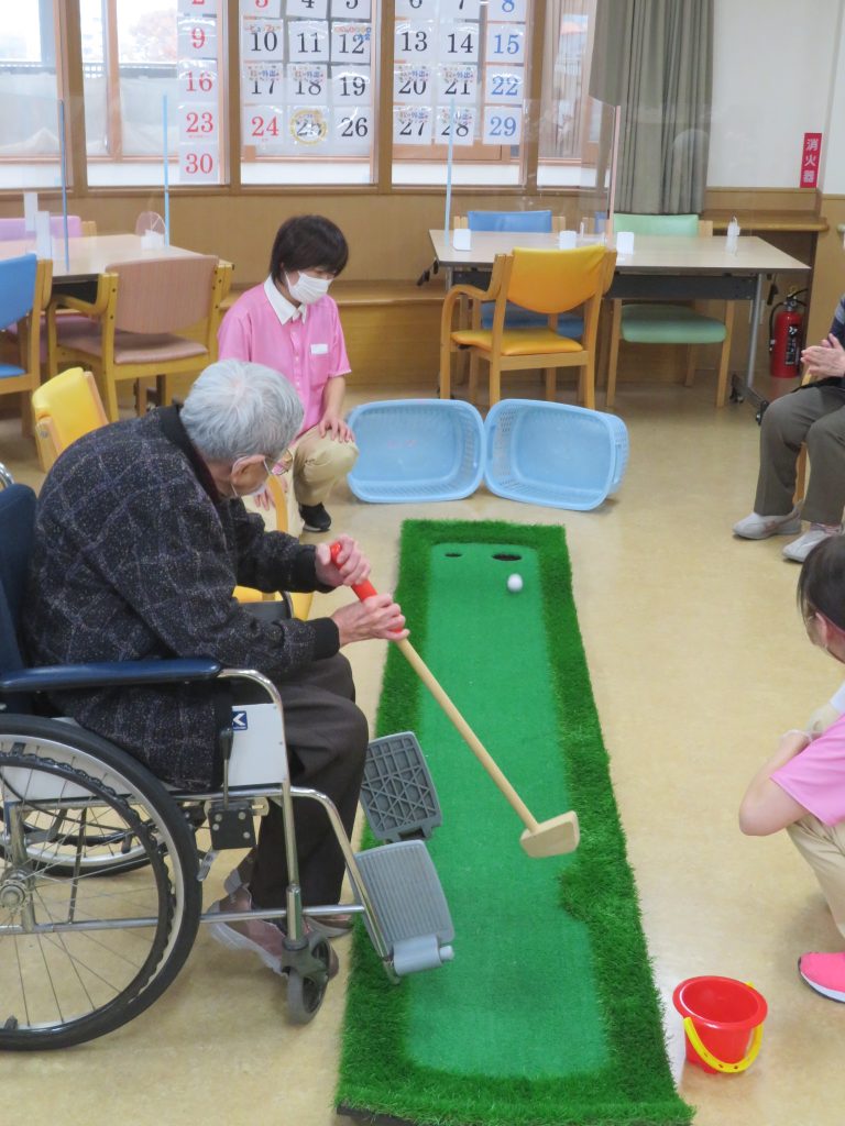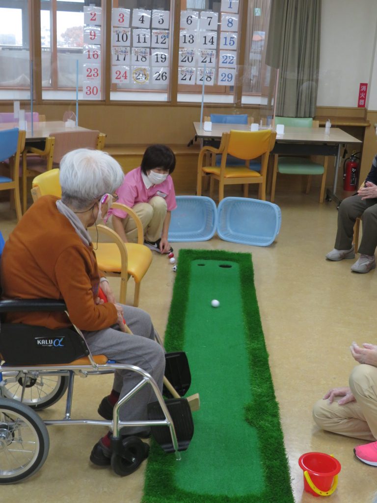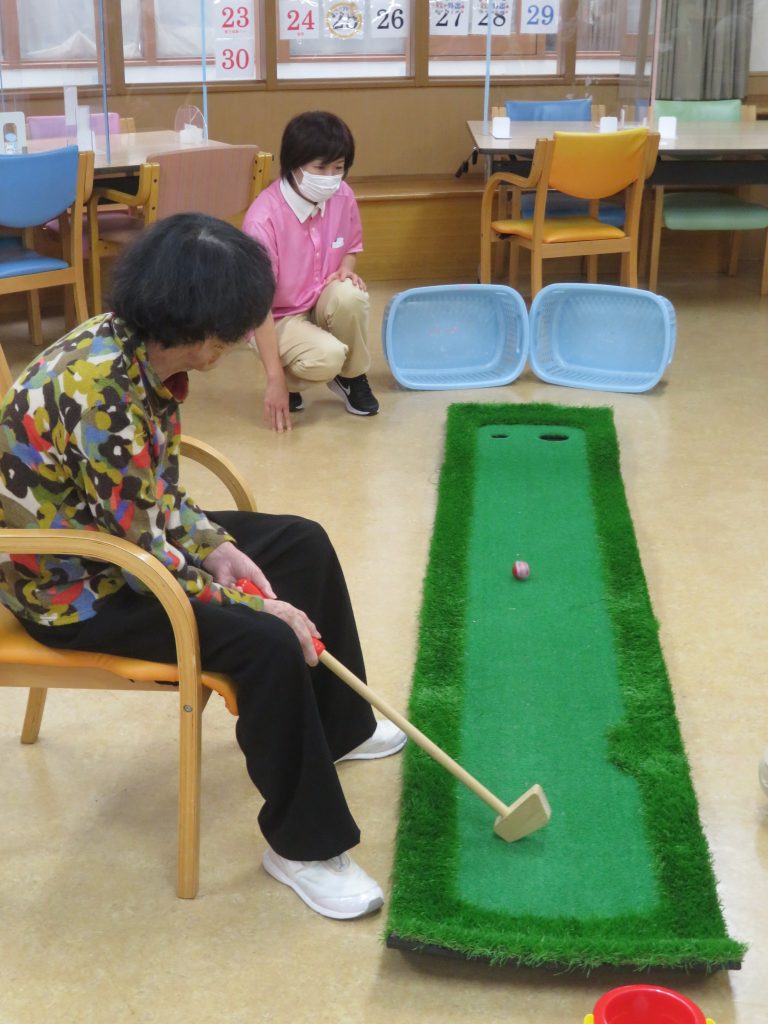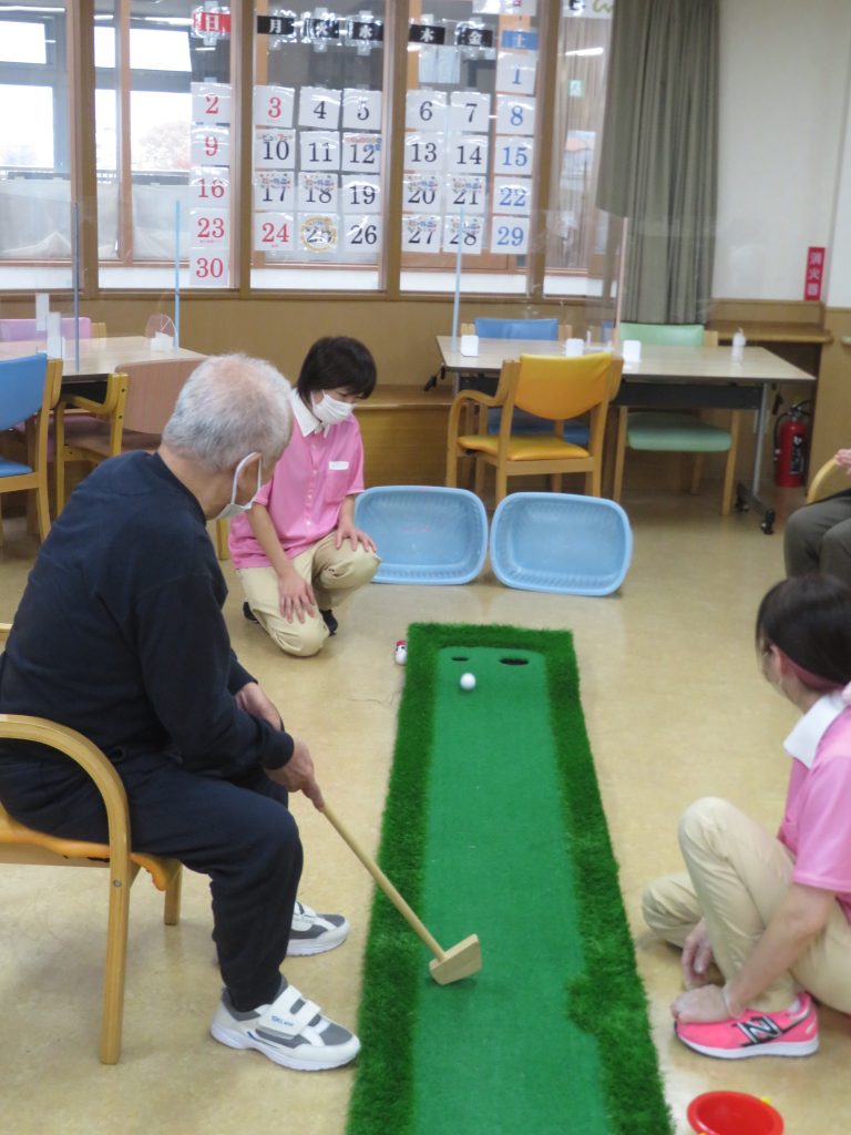 今日の運動クラブは【パターゴルフ】です。昭和のドラマに出てくる成金社長が社長室で使っている、あのパターゴルフです。カップに入りそうで入らない、入ればスカッと楽しいゲームです。