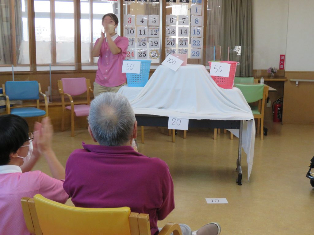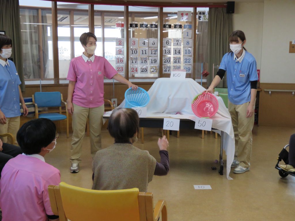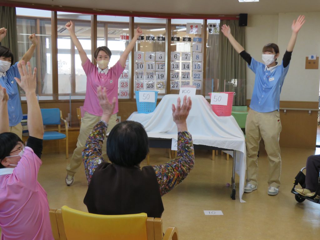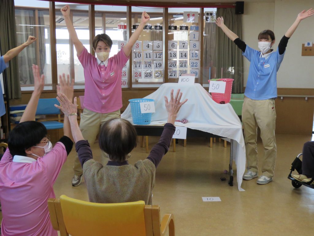 今日の運動クラブは【お手玉でポン!】ゲームです。職員が考えたゲームでお手玉を投げて点数の書かれたカゴに「ポン!」と入れるゲーム👍