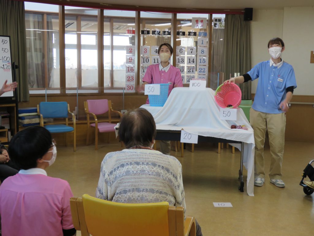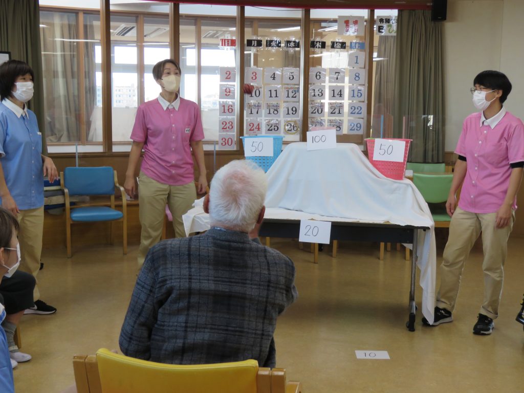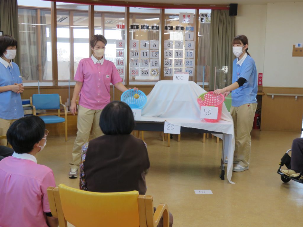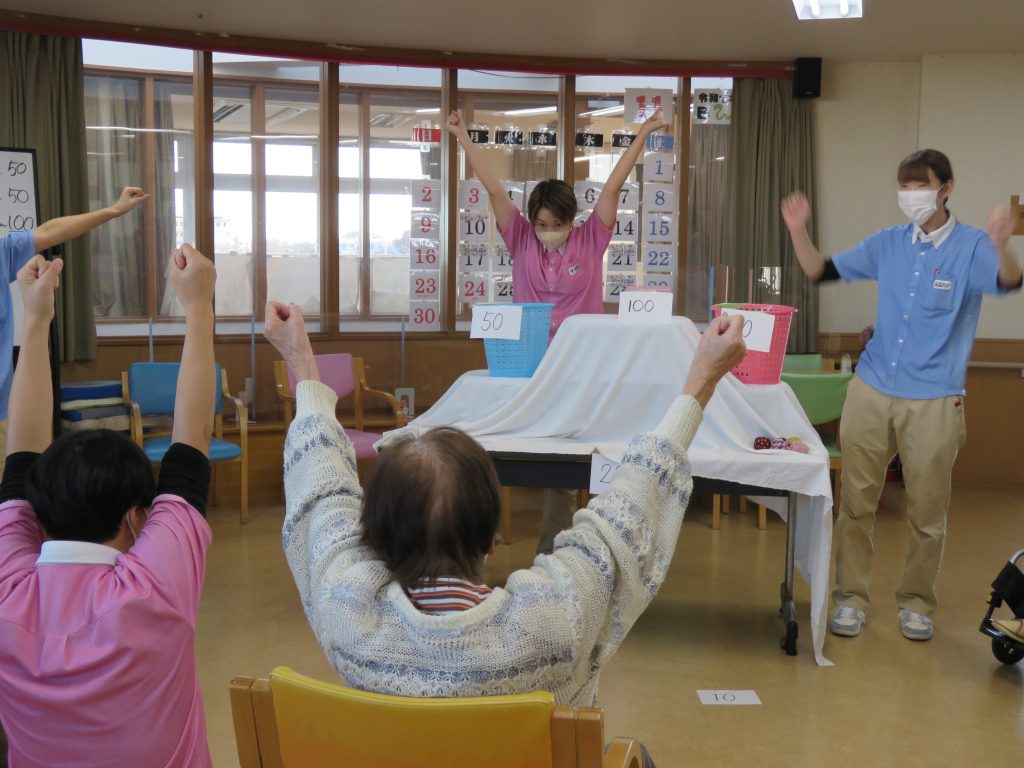 今日の運動クラブは【お手玉でポン!】ゲームです。職員が考えたゲームでお手玉を投げて点数の書かれたカゴに「ポン!」と入れるゲーム👍