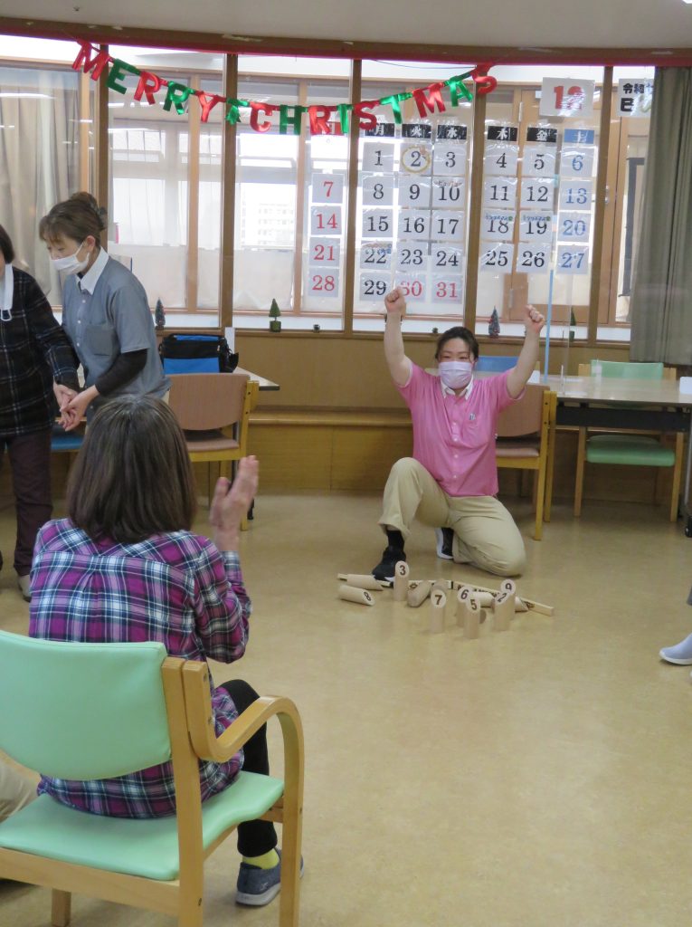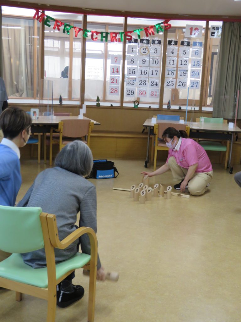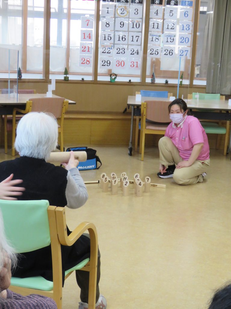 本日の運動クラブは「モルック」です。フィンランド発祥のスポーツです。木の棒を投げ得点のついたピンを倒し合計50点を目指すスポーツです。サンシャインホームデイサービスセンターでは最高得点を競い合いました。