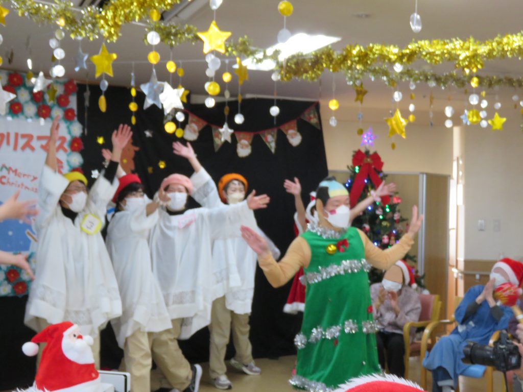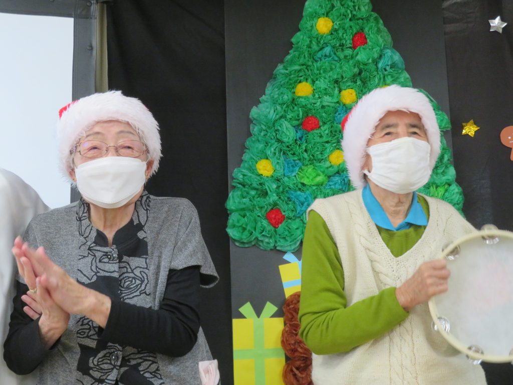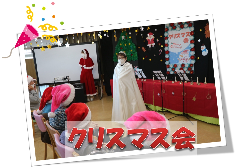 「クリスマス会」今回は職員の余興「ハンドベル演奏」から始まり「クリスマスカラオケ大会」その後、利用者様の音頭で「カンパイ」クリスマスケーキを楽しんで頂き最後は「クリスマスビンゴ大会」上位2名の方に賞品をプレゼント。利用者様全員にもクリスマスプレゼントをお配りしました。その様子をご覧ください。