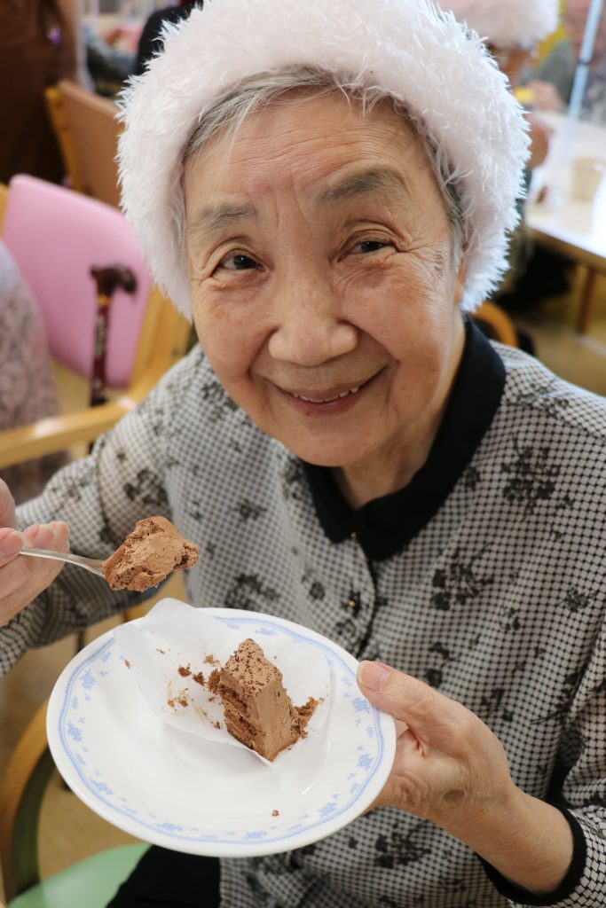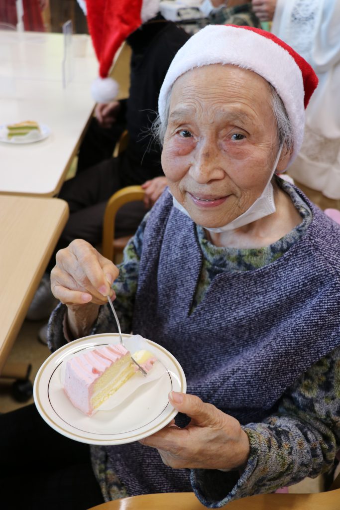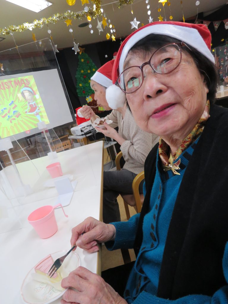 クリスマスカラオケ大会の後はクリスマスケーキを楽しんで頂きます。利用者様の音頭で「カンパーイ」🥂