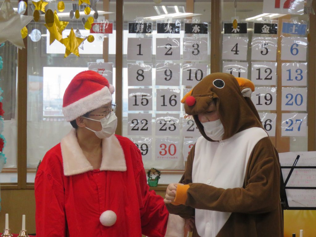 サンタさんが皆さんにハンドベル演奏をプレゼントする為に「フルーツポンチーS」を連れて来てくれました。そしてトナカイさんに「良いベルが有ったらあげるよ」トナカイさん良いベルが見つかると良いね。