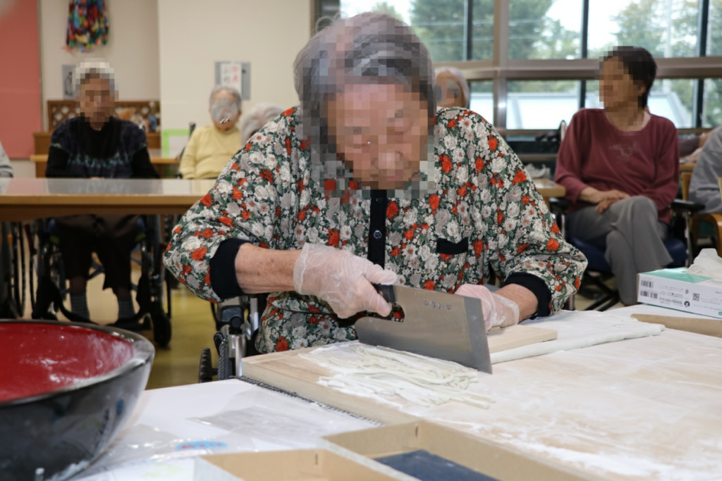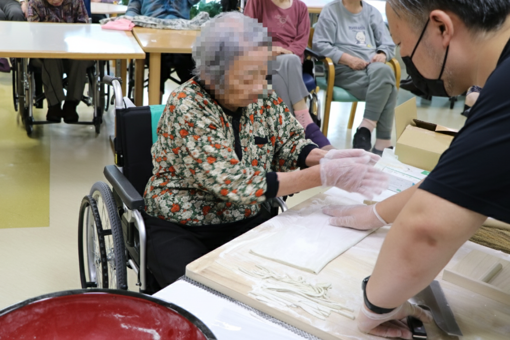 秋の深まりを感じるこの季節、サンシャインホームでは恒例の「蕎麦打ち行事」を開催しました。今年も入所者の皆さまと一緒に、香り高い秋そばを楽しむひとときを過ごしました。この行事は毎年行っているもので、職員の中にはすっかり“蕎麦職人”のような腕前を持つ者もおり、打ち方やこね方にもこだわりが見られます。粉を練るところから始まり、丁寧に伸ばして切る工程では、入所者の皆さまにも参加していただきました。包丁を手に、真剣な表情で蕎麦を切る姿はとても頼もしく、職員も思わず笑顔に。皆さまの手で切られた蕎麦は、どれも味わい深く、温かみのある仕上がりとなりました。